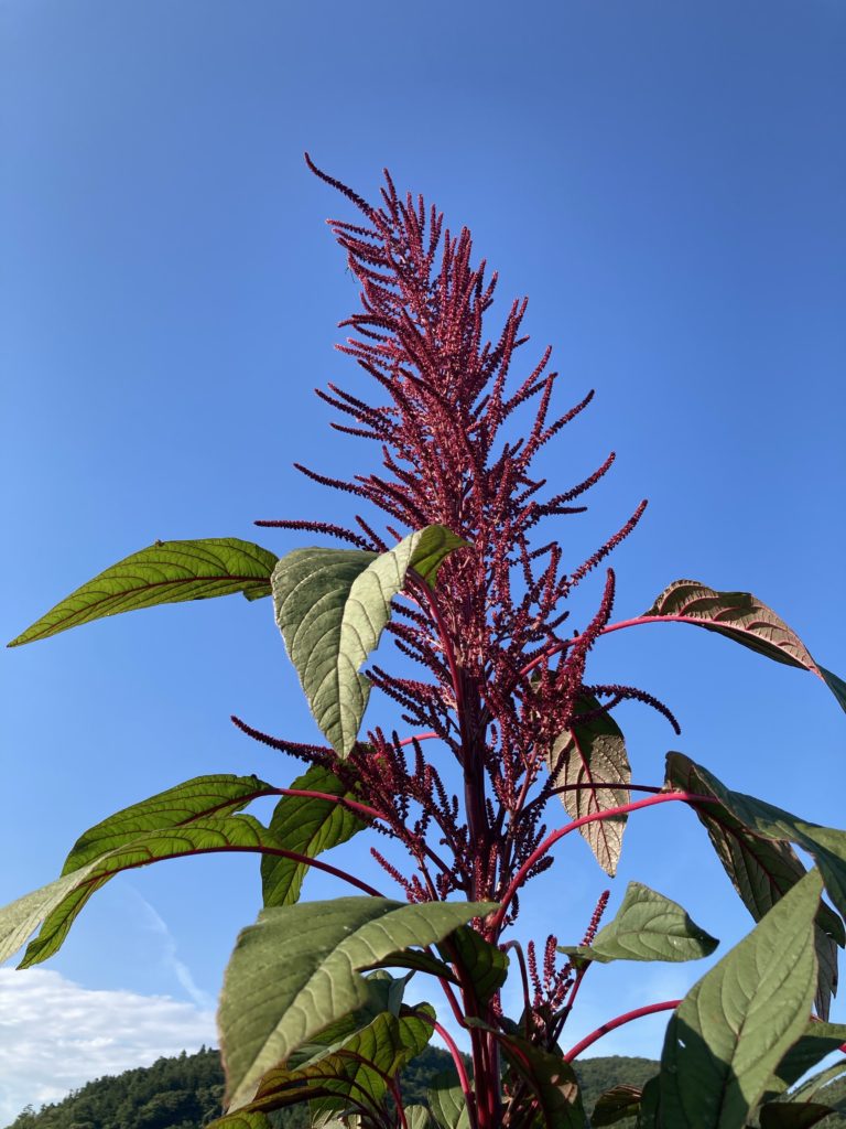 赤い穂がキャンドルの炎のよう、青空に映えて美しい。来年は畑の縁取りに植えてみようかと思っている。