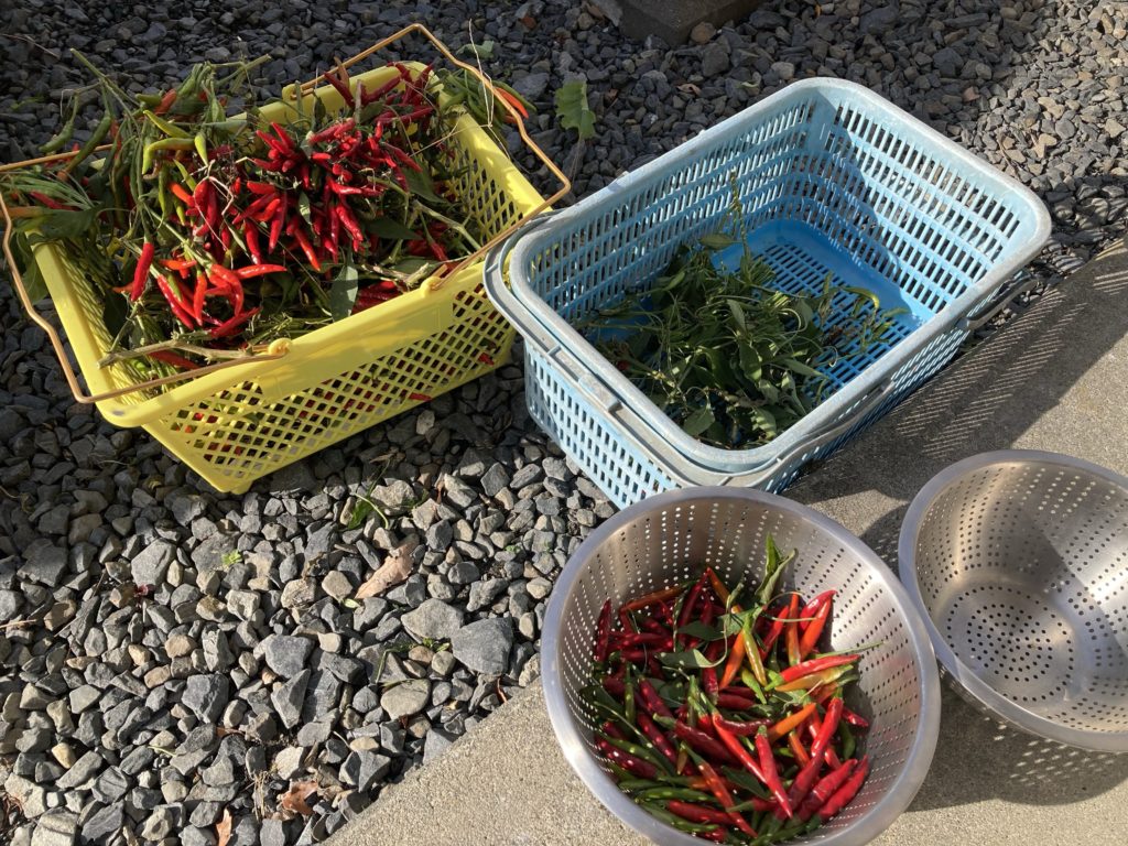 晴れ間の広がった午前中には、唐辛子を枝から摘み取る作業。