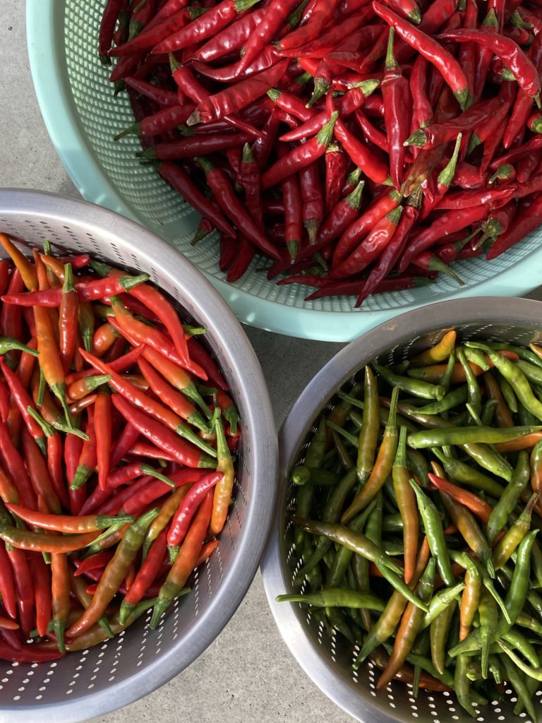 昨日、畑のすべての唐辛子を収穫し、カゴいっぱいに持って帰ってきていた。
