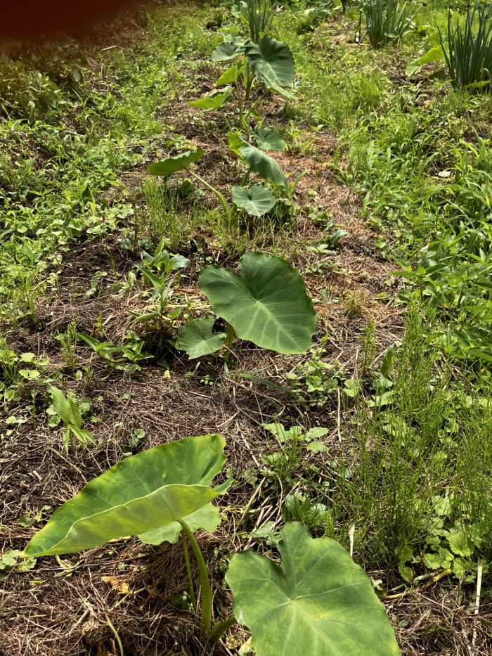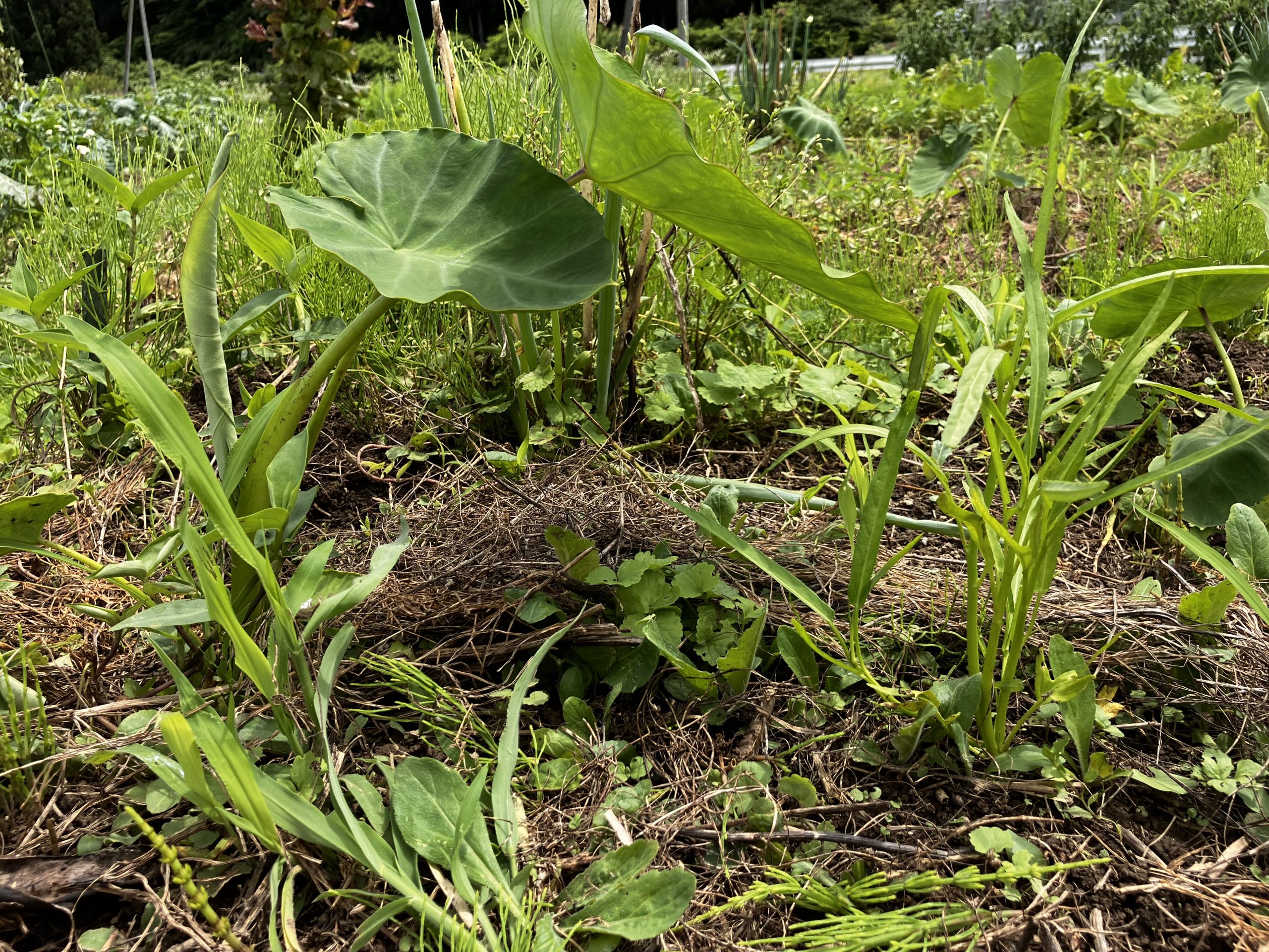 里芋と一緒に育つエンサイ(空芯菜)